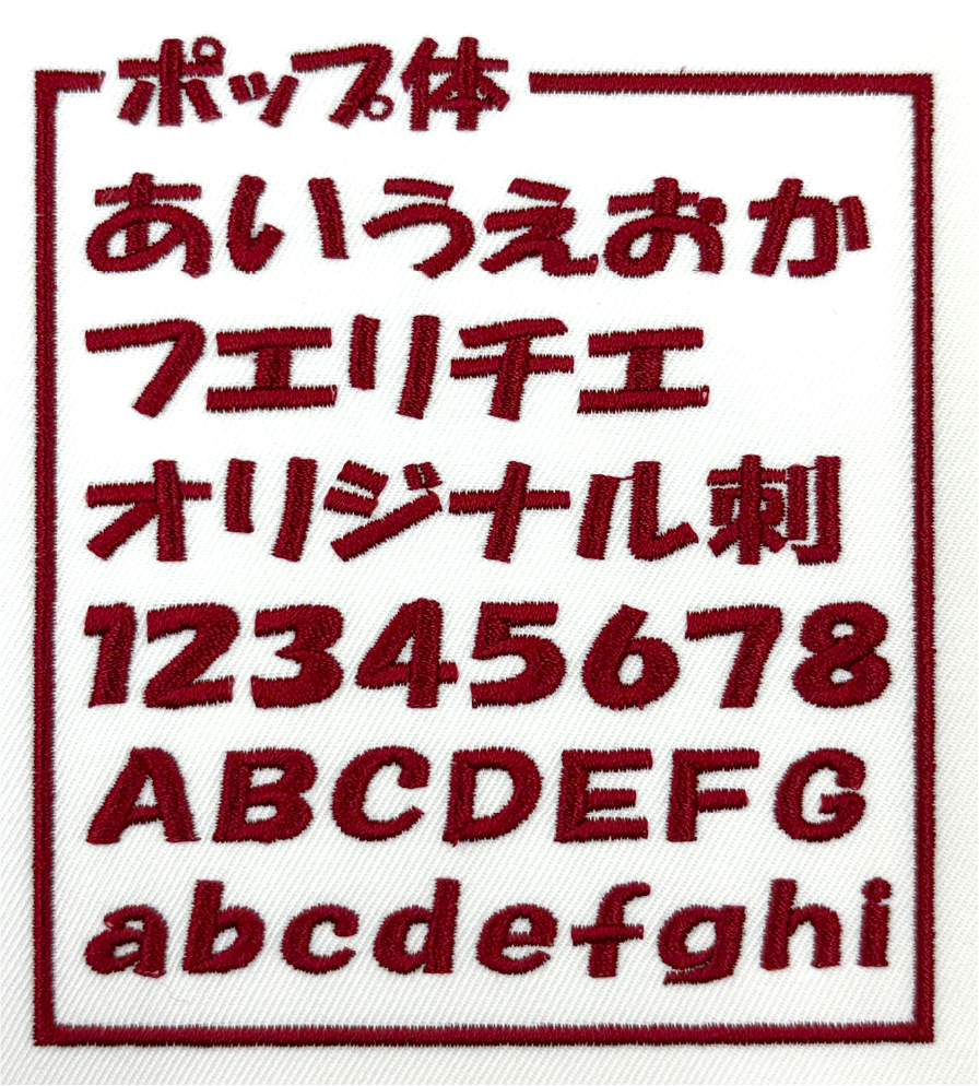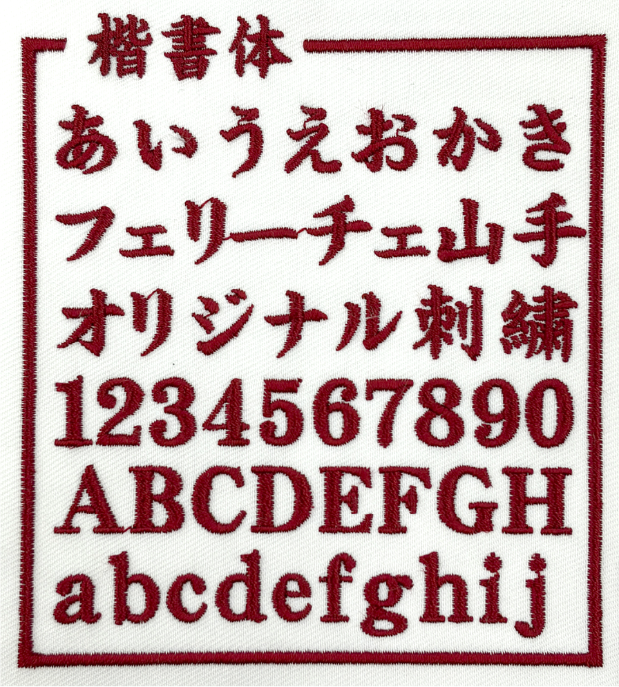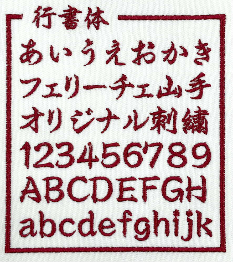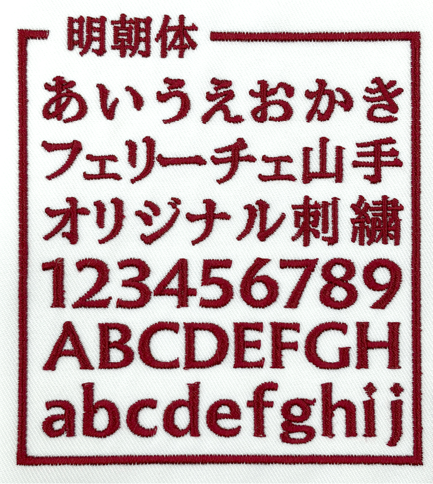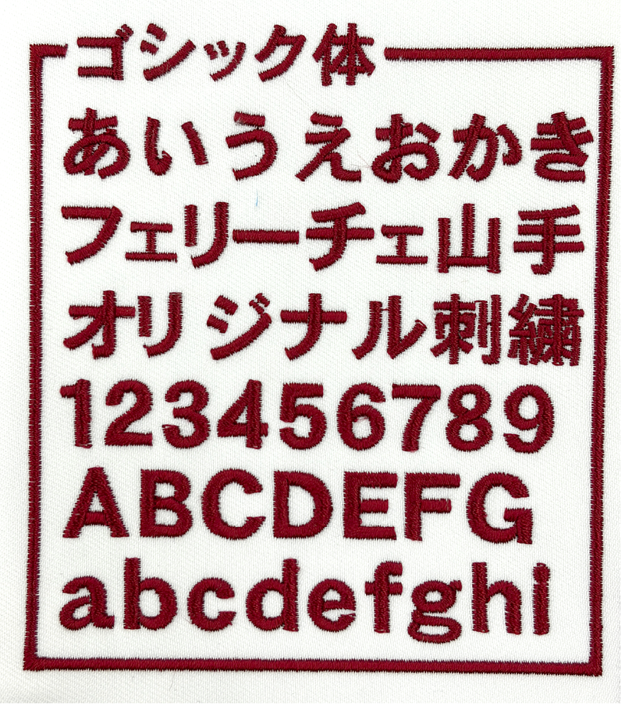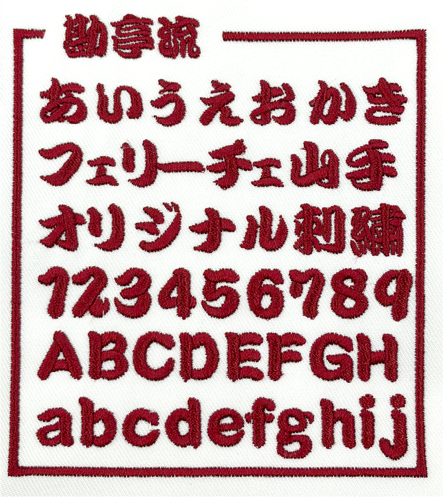 左胸や袖などに、文字サイズ縦1cm〜2cm程度で書体見本から選んだ書体、ご希望の糸色で刺繍します。