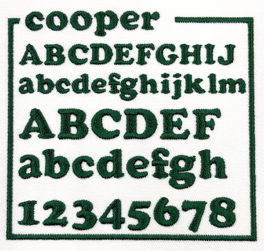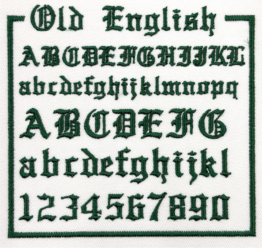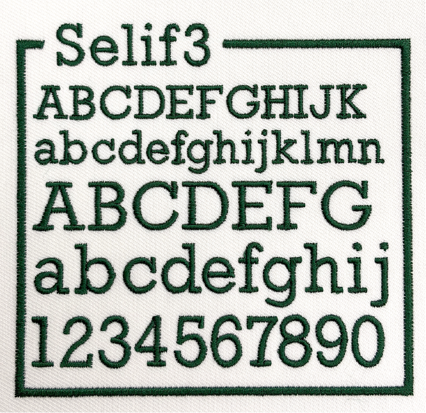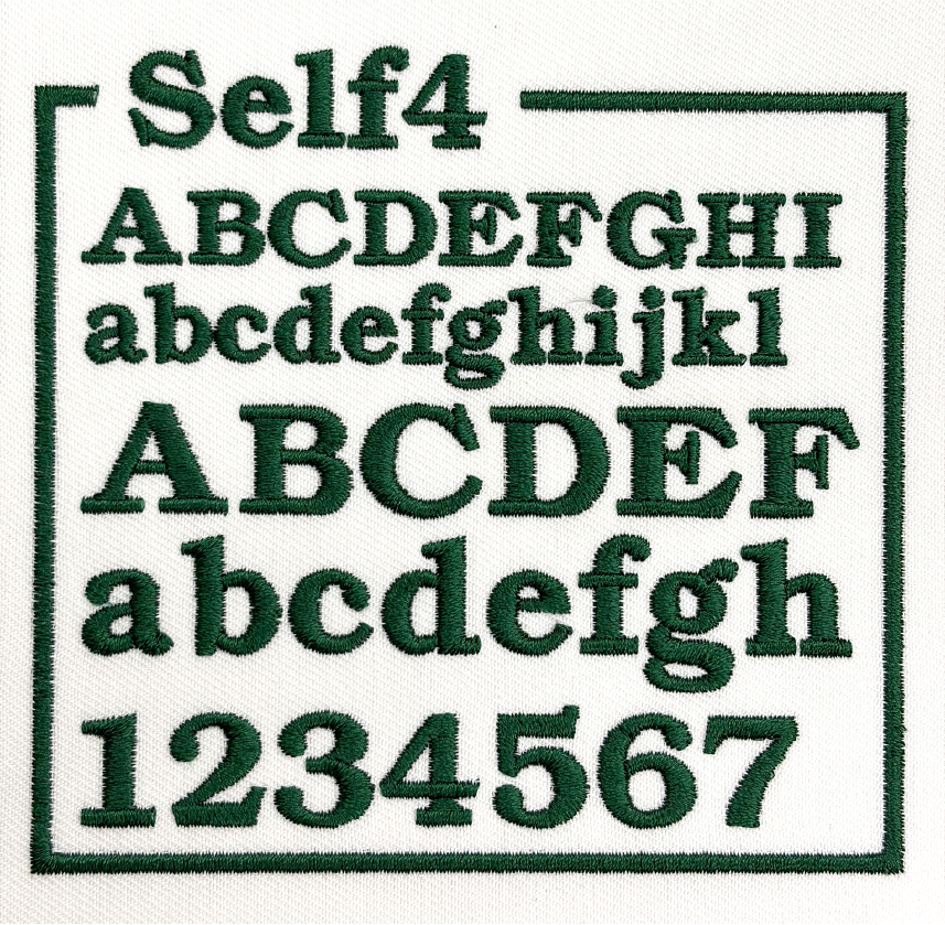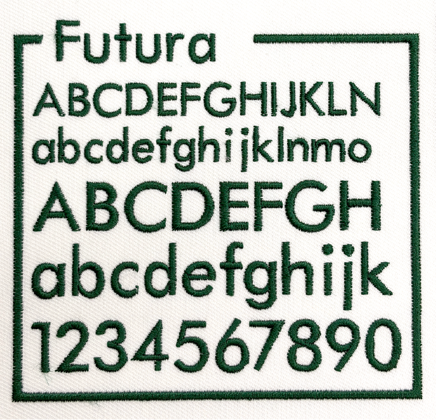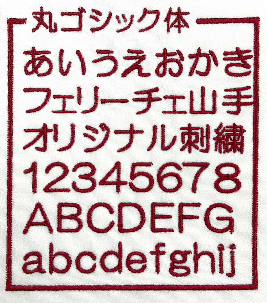 左胸や袖などに、文字サイズ縦1cm〜2cm程度で書体見本から選んだ書体、ご希望の糸色で刺繍します。