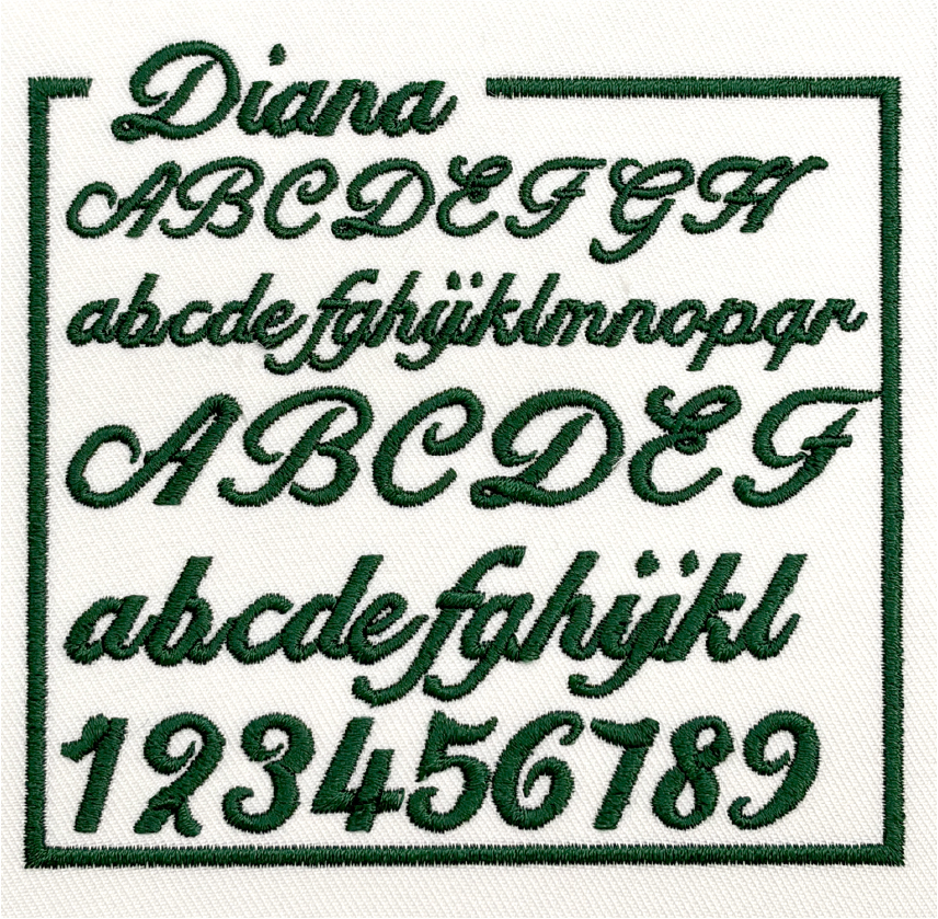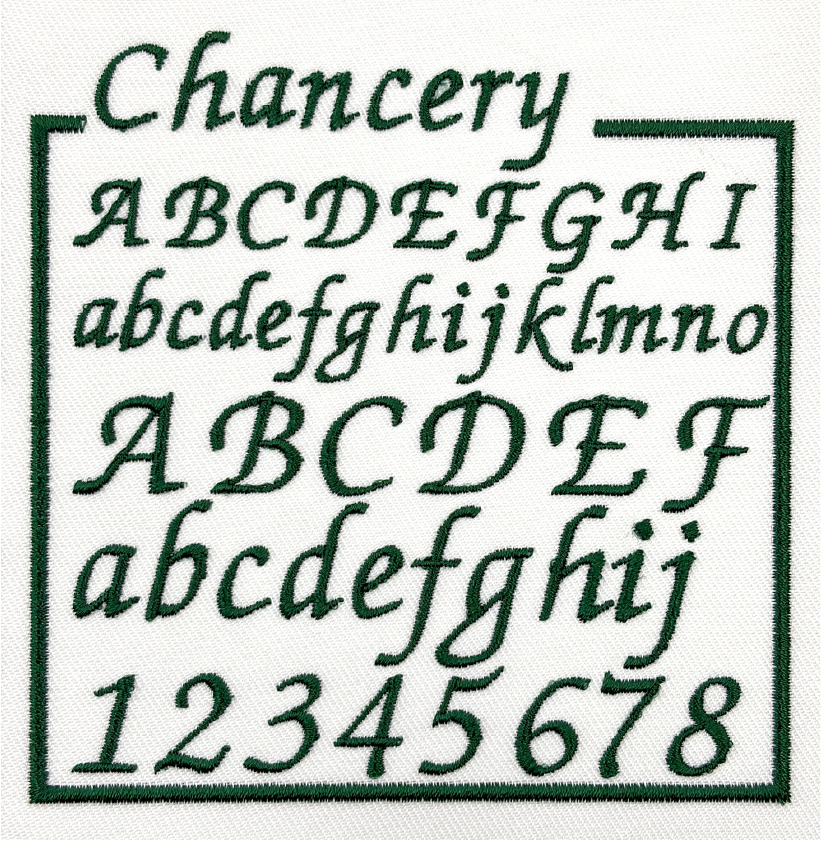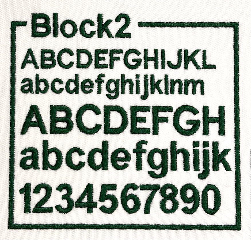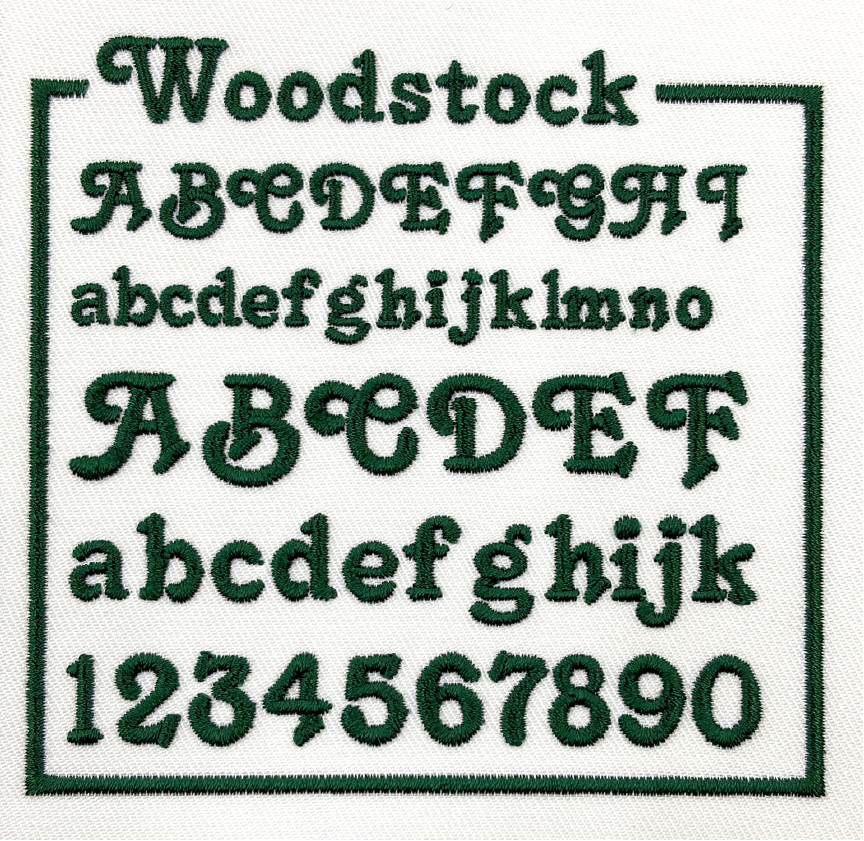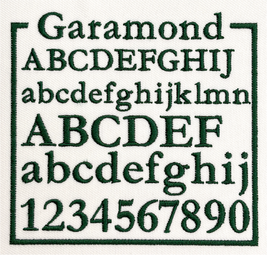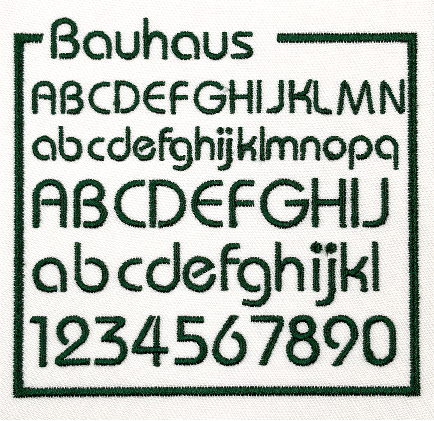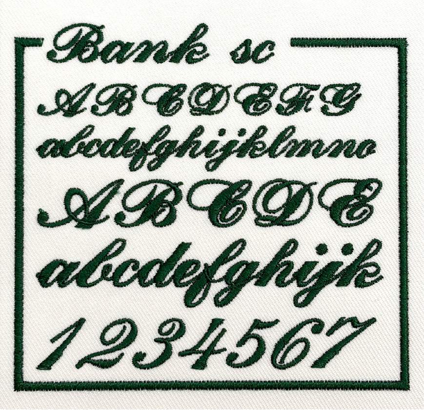 左胸や袖などに、文字サイズ縦1cm〜2cm程度で書体見本から選んだ書体、ご希望の糸色で刺繍します。
